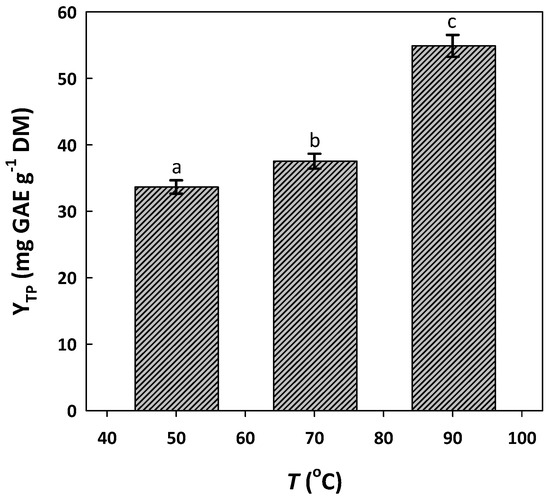 Likewise, the effect of temperature on YTP was tested by maintaining a residence time of 120 min. The level of 90 °C was chosen as the upper limit tested, in line with previous studies, to avoid possible thermally induced polyphenol decomposition [28]. As can be seen in Figure 3, the increase in temperature from 50 to 70 °C was accompanied by a significant increase in YTP. The effect from 70 to 90 °C was similar, pointing to a positive influence of temperature on polyphenol extraction.
