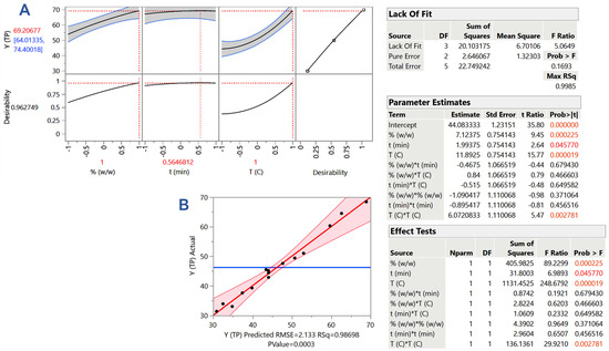 Plot (A) presents the desirability faction, the maximum predicted YTP, and the optimum C, T, and t. Plot (B) shows the correlation between the measured (actual) and predicted values of the response (YTP), derived from the response surface methodology. Critical statistical parameters (square correlation coefficient (R2), p-value for the model) are also provided. The inset tables display statistics related to the response surface methodology. Values assigned with colors are statistically significant (red: p < 0.05; orange, p < 0.001).