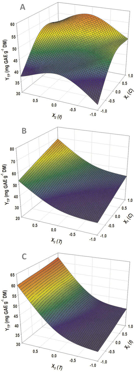 This quadratic model was visually depicted in the form of 3D plots (Figure 5), to provide an at-a-glance impression of the effect of simultaneous variation in the three variables on the response. In addition, the tool of desirability function (Figure 4A) permitted the estimation of the optimal predicted settings for the process, which were C = 80% (w/w), t = 154 min, and T = 90 °C. Under these conditions, the maximum predicted response (YTP) was determined to be 69.21 ± 5.20 mg GAE g−1 DM.
