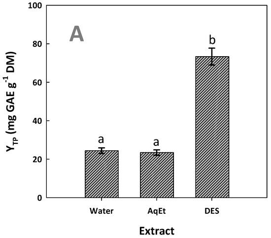 Total polyphenol (A) and total flavonoid yields (B) achieved after performing extractions with the DES/water solvent system (assigned as DES) and water and 60% aqueous ethanol (assigned as AqEt), under optimized conditions (t = 154 min, and T = 90 °C). Values denoted with different letters (a, b, c) display statistically significant differences (p < 0.05).