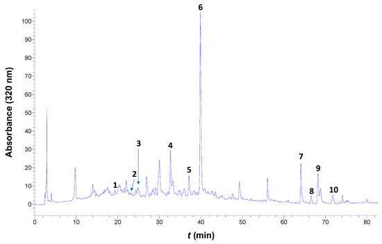 Furthermore, to portray the analytical polyphenolic composition and to spot possible important differences, the extracts were also analyzed by HPLC, leading to ten compounds being tentatively identified (Figure 7). Thus, the distinction of the efficacy of the solvents tested was based on the quantification of these compounds.