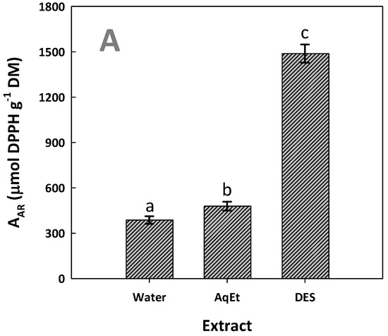 The antioxidant tests were carried out to ascertain whether the increased polyphenol concentration in the extracts generated with DES would be accompanied by enhanced antioxidant activity. The results obtained confirmed that the DES extract was indeed far more active than both the aqueous and the hydroethanolic extracts. In particular, the DES extract displayed an AAR, which was significantly higher (p < 0.05), and it was almost three times more active than the extract produced with aqueous ethanol (Figure 8A).