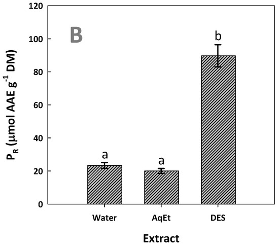 Likewise, the DES extract exhibited significantly higher PR, which was 3.8 times higher than that determined for the aqueous extract (Figure 8B). This outcome did confirm that the DES extract, being more enriched in polyphenols, had the strongest antioxidant activity. This observation is in line with previous studies, where WOP extracts with higher polyphenolic concentrations also showed stronger antioxidant activity [28]. Furthermore, it has been found that the antioxidant activity of WOP extracts, determined by both DPPH and 2,2′-azino-bis(3-ethylbenzothiazoline-6-sulfonic acid (ABTS) methodologies, were positively correlated with the total polyphenol concentration, but not with the total flavonoid concentration [43]. Similar results concerning the correlation between total polyphenol concentration and antioxidant activity, estimated by different tests, were reported by other authors too [44].
