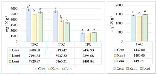 The highest content of polyphenols (Figure 1) was determined in ‘Cera’ and ‘Loni’ cultivars (8708.88 and 7920.87 mg 100 g−1 respectively); ‘Cera’ was also distinguished by its concentration of tannins (8193.47 mg 100 g−1). No significant differences were recorded in flavonoids content.