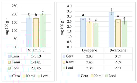 Anthocyanins (CTA) were present in a higher quantity in the variety ‘Loni’ (1432.00 mg 100 g−1; Figure 1), and vitamin C (Figure 2) predominated in the same cultivar (200.85 mg 100 g−1), exceeding by at least 12.5% the amounts determined in the other two varieties. The total amounts of anthocyanins identified varied significantly within the cultivars in the study conducted by Raudonė et al. [28]. The variation of carotenoids (Figure 2) was nonsignificant. Carotenoids are natural pigments that are present in fruits and vegetables and make an important contribution to human health.