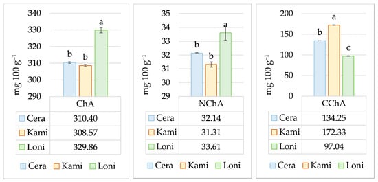 Content of chlorogenic (ChA), neochlorogenic (NChA) and cryptochlorogenic acids (CChA) in dry honeyberry residue depending on cultivar. Different letters used on the bar charts (a, b, c) represent statistical significance between the bars or groups according to DMRT.
