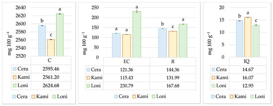 Catechin, epicatechin and rutin (Figure 4) accumulated in higher concentrations in the ‘Loni’ cultivar, at 2624.68 mg 100 g−1, 230.79 mg 100 g−1 and 167.68 mg 100 g−1, and presented average values in ‘Cera’ cultivar. Moreover, isoquercetin also presented an average content in this cultivar but predominated in ‘Kami’ (16.07 mg 100 g−1). Oszmiański et al. [24] reported that the dehydrated residue contained lower levels of the flavonoids catechin (1696.98–2013.13 mg 100 g−1), epicatechin (52.22–80.55 mg 100 g−1) and rutin (3.69–6.02 mg 100 g−1) but higher levels of isoquercetin (53.21–61.86 mg 100 g−1).