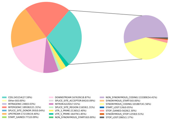 SNP proportions at different genomic locations: INTERGENIC represents intergenic regions, INTRON represents intronic regions, CDS represents coding sequence regions, UPSTREAM/DOWNSTREAM represent SNP sites located within 5 kb upstream/downstream of genes, UTR_5_PRIME/UTR_3_PRIME represent SNP sites in the 5’ UTR and 3’ UTR of genes, SPLICE_SITE_ACCEPTOR/SPLICE_SITE_DONOR represent splice site mutations (within the first 2 bp of an exon), SPLICE_SITE_REGION represents splice site region mutations (1−3 bp variation in exons or 3−8 bp variation in introns), START_GAINED represents gained start codons (in non-coding regions). SNP mutation types within CDS regions annotation: START_LOST represents lost start codons, SYNONYMOUS_START/NON_SYNONYMOUS_START represent synonymous/non-synonymous start codon mutations, SYNONYMOUS_CODING represents synonymous coding mutations, NON_SYNONYMOUS_CODING represents non-synonymous coding mutations, STOP_GAINED/STOP_LOST represent gained/lost stop codons.