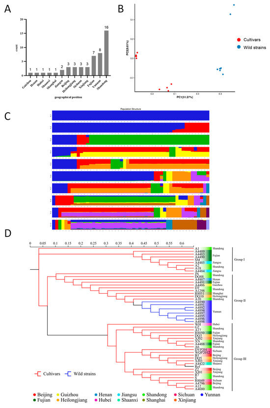 To validate the results of the phylogenetic analyses, all of the 888,536 high-quality SNPs from the 50 tested strains were analyzed using EIGENSOFT (v6.0.2) software. The PCA analyses helped to provide insight into the spatial representation of the samples in terms of clustering and phylogenetic relationships. Two-dimensional plots of the values of each sample on the first principal component (PC1) and the second principal component (PC2) showed the spatial genetic relationships between the materials, with PC1 and PC2 explaining 51.27% and 8.61% of the variance, respectively. The results of PCA showed significant genetic diversity between the cultivated strains (Cultivars) and the wild strains (Wild strains) (Figure 2B). Genetic diversity was also observed among strains within Cultivars and wild strains. Generally, the distributions of the two dimensions generated by PCA analyses of all the 50 strains showed the classification of all the cultivars into two clusters (Figure 2A).
