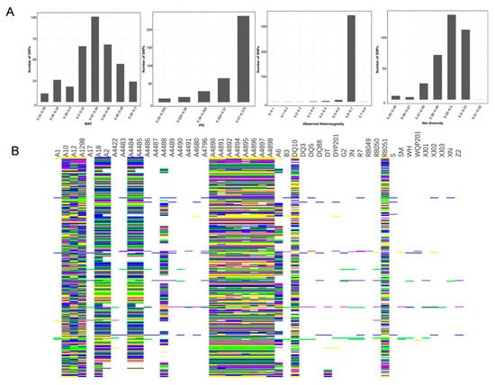 In this study, IQ-TREE (v2.0) software was used to construct a phylogenetic tree for each strain based on all high-quality SNPs using the maximum likelihood method with 1000 bootstrap replicates [51]. Cluster analysis was performed, and the tested strains were divided into three main groups (Figure 2D), and it was generally consistent with the results of the PCA and population structure analysis, indicating the reliability of the results in elucidating the relationship between and within clusters. Cultivars that originated from Fujian, Shandong, and Jiangsu were clustered in Group I, indicating high genetic similarity among them. As we know, most of the cultivars were domesticated from wild strain rather than hybrids (personal communication). A number of cultivars and the wild germplasm from Yunnan were apparently clustered together in Group II, which may indicate the same geographical origin of these strains. Group III clustered the cultivated strains including the two commonly used varieties R8049 and R8050, which were selected almost 20 years ago. Although strains in this group did not have the same origin, they are genetically related. Generally, lower genetic similarity was detected among strains in Group II than in Group I and III.