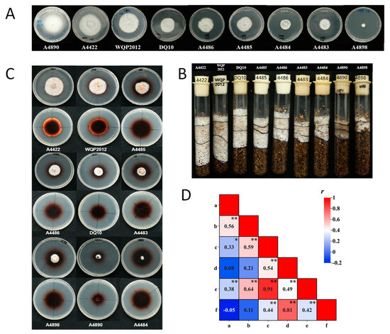 (A) Mycelium growth of representative strains on PDA plates (10 d). (B) Mycelium growth of representative strains in substrate culture tubes (20 d). (C) Mycelium growth of representative strains on guaiacol agar plates (10 d). (D) Correlation between agronomic traits of mycelium: a and b indicated the mycelial growth rate on PDA plates and in the substrate culture tubes; c and d indicated the diameters of the mycelial zones and the oxidation zones on guaiacol agar plates (5 d); e and f indicated the diameters of the mycelial zones and the oxidation zones on guaiacol agar plates (10 d). Asterisks denote statistically significant correlations (* indicates significance at p < 0.05; ** indicates significance at p < 0.01).