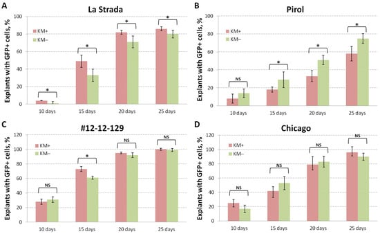 The percentage of explants displaying GFP expression in cells of potato cultivars, including ‘La Strada’ (A), ‘Pirol’ (B), # 12-12-129 (C), and ‘Chicago’ (D) under selective (Km+) and non-selective (KM−) cultivation. “*” indicate statistically significant differences calculated according to t-test (p ≤ 0.05), NS—non-significant.