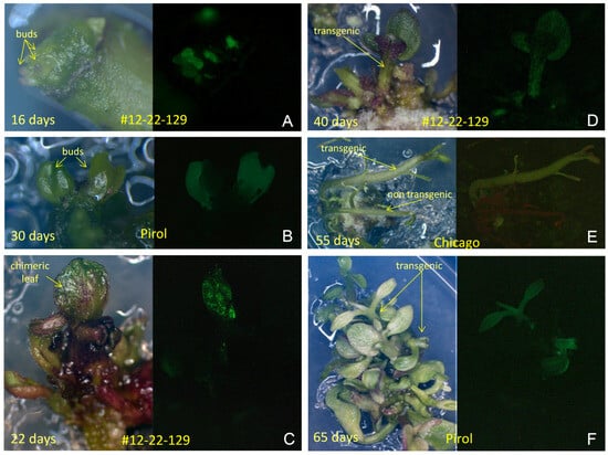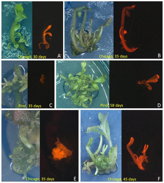 Similarly to the previous experiments, the early regenerating cv. ‘Chicago’ produced chimeric and transgenic plantlets by the end of the 4th week after co-cultivation (Figure 7A,B). Conversely, on explants of the ‘late’ cv. ‘Pirol’ fluorescent buds primarily appeared during the same cultivation period (Figure 7C). As a result, the majority of RFP-expressing plantlets (Figure 7D) of ‘Pirol’ were developed between 50 and 80 days of the experiment (Figure 7D), two-three weeks later than in ‘Chicago’ (Figure 7B).