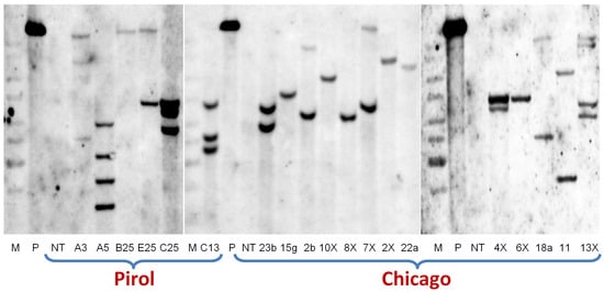 It is noteworthy that the number of explants that initially produced GFP-positive transgenic buds exceeded the resulting number of transgenic shoots (Table 2). Considering the significant portion of chimeric escapes, it is plausible that some of the generated stable transformants are duplicates, potentially stemming from the same transgenic cell aggregates of the explant, or some explants may produce several independent transgenic events. To address this, we carried out a molecular characterization of several transgenic events through Southern blot analysis. For instance, the analysis of 13 out of 15 transgenic ‘Chicago’ plants using a GFP probe revealed the disparate pattern of T-DNA insertions (Figure 5). Similarly, the analysis of insertion patterns in transgenic ‘Pirol’ plants, which we initially suspected to be duplicates due to their origin from the same explants, confirmed their independent origin (Figure 5).