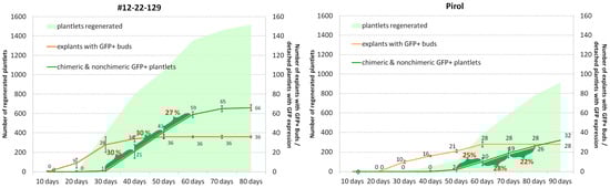 In the present study, we found that the genotype-specific timing of plantlet regeneration significantly influenced the identification of the GFP-positive plants. In Figure 5, we have combined the number of detached plantlets with the occurrence of explants that formed GFP+ buds, along with the number of detached chimeric/non-chimeric plantlets throughout the entire regeneration stage. The results for two contrasting genotypes are presented. Considering the regeneration experiments, #12-22-129, characterized as the ‘early’ regenerative cultivar, produced shoots much faster than the ‘late’ regenerating cultivar ’Pirol’. By the 50th day post agrobacterial inoculation, almost 100 plantlets were detached from Pirol’ explants, while with #12-22-129, over half of all regenerated explants (nearly 1000 shoots) had already been collected. Similarly, the first GFP-expressing buds were observed in #12-22-129 explants within the second week of cultivation, whereas in ‘Pirol’ they emerged 10–15 days later. After 45 days of cultivation, no new explants with GFP-positive buds were found on #12-22-129 explants, whereas in ‘Pirol’, the number of explants with such buds continued to appear until the 60th day of the experiment (Figure 5).