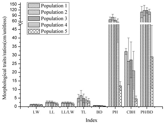 Clear differences were observed among different populations in terms of relative range for each trait (Table 2). Leaf length showed the greatest variation in Population 1, with a range of 90.68%, while the ranges for other sites ranged from 14.89% to 41.13%, decreasing with increasing altitude. The maximum value for leaf width was found in Population 4, at 96.13%, while the range for other sites was relatively small, between 11.98% and 21.42%, with the minimum value found in Population 5. Overall, there was a trend toward decreasing leaf width with increasing altitude. The relative ranges for twig length and basal diameter were highest in Population 3, at 97.33% and 79.81%, respectively, and the overall ranges were large. Except for Population 5, the relative range of twig length was above 50% in all other populations, whereas the same was true for basal diameter. The maximum relative ranges for plant height and clear bole height were both observed in Population 2, at 89.12% and 95.36%, respectively, and the ranges were large for all other populations except for Population 5, where they were less than 50%.