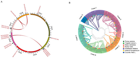 Identification and evolutionary analysis of MrBGALs. (A) Circos plot of M. rubra genome annotated with BGAL genes. The eight chromosomes are arranged circularly and represented by labeled ideograms. On the outside of the ideograms, the BGAL genes’ accession numbers were labeled based on their chromosomal position. Links with dark red color show the segmental duplication or WGD relationship between BGAL genes. (B) Phylogenetic tree of BGAL genes among Myrica rubra, Cucumis melo, Arabidopsis thaliana, Solanum lycopersicum, Prunus persica, Malus domestica, and Fragaria vesca. The gene accession numbers of all the BGAL genes are shown in Table S1.