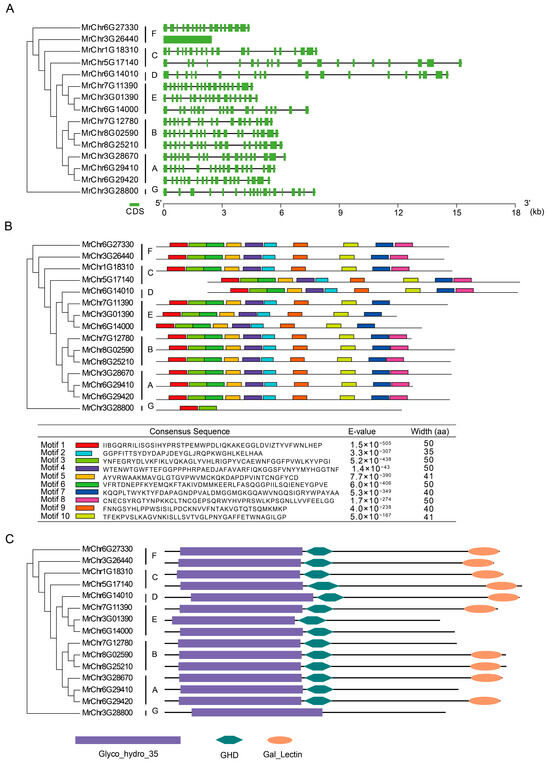 Phylogenetic tree, gene structure, and motif analysis of MrBGALs. (A) Phylogenetic tree was clustered into seven clades: A, B, C, D, E, F, G (left). Gene structure of BGAL genes and CDS regions are displayed with green filled rectangles, and the black line represent the intron regions (right). (B) Phylogenetic tree of BGAL genes (left). Distribution of conserved motifs of top 10 along the gene regions of BGAL genes (right). The sequences and the lengths of top 10 conserved motifs filtered with the e-value 1 × 10−5 (bottom). (C) Phylogenetic tree with conserved domains. Phylogenetic tree of BGAL genes (left). Conserved domains’ distribution (right).