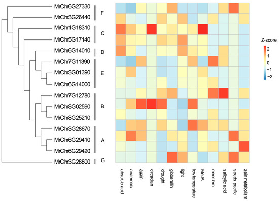 To enhance the contextualization of the evolutionary classification, we applied the analytical approach previously used for the identification of MrBGALs to extract the longest transcripts from the selected six species for evolutionary analysis. Individually scrutinizing the BGAL family members of Arabidopsis thaliana (L.) Heynh, Solanum Lycopersicum, Cucumis melo, Prunus persica, Fragaria vesca, and Malus domestica, we aligned the protein sequences of family members and constructed an evolutionary analysis, followed by clade classification. Our comprehensive analysis revealed that the 122 BGALs from 7 species could be systematically categorized into 7 groups: Clade A (24), Clade B (22), Clade C (19), Clade D (6), Clade E (27), Clade F (20), and Clade G (6) (Figure 1B). Genes within the same clade exhibit a notable potential for shared functionality, thereby allowing us to infer and predict the functional attributes of MrBGALs based on their placement within corresponding branches. The expression levels of Mdβ-Gal1 (MD09G0168900, Clade A), Mdβ-Gal3 (MD02G0117600, Clade B), Mdβ-Gal5 (MD10G0056800, Clade B), and Mdβ-Gal11 (MD10G0078800, Clade B) gradually increased during apple fruit development [28]. This observation suggests a potential association of these clades (Clade A: MrChr6G29410, MrChr6G29420, and MrChr3G28670; Clade B: MrChr8G02590, MrChr7G12780, and MrChr8G25210) with fruit development.