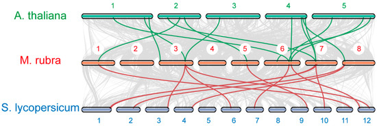 Co-linearity between 5 chromosomes of Arabidopsis thaliana, 8 chromosomes of Myrica rubra, and 12 chromosomes of Solanum lycopersicum. The orthologous genes between Arabidopsis thaliana and Myrica rubra are highlighted with a green color, and the orthologous genes between Myrica rubra and Solanum lycopersicum are presented with a red color.