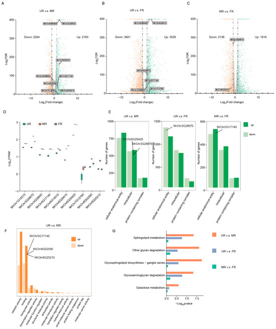 Expression patterns of MrBGALs in different fruit development stages. (A–C) Volcano plots illustrating the differential expression of genes across the three stages. (D) Expression patterns specifically highlighting the MrBGALs across these three stages. (E) Cell component analysis of gene ontology (GO) enrichment related to differentially expressed genes. (F) Molecular function analysis of GO enrichment specifically in the UR-MR stage. (G) KEGG (Kyoto Encyclopedia of Genes and Genomes) pathway enrichment related to differentially expressed genes observed across the three stages.