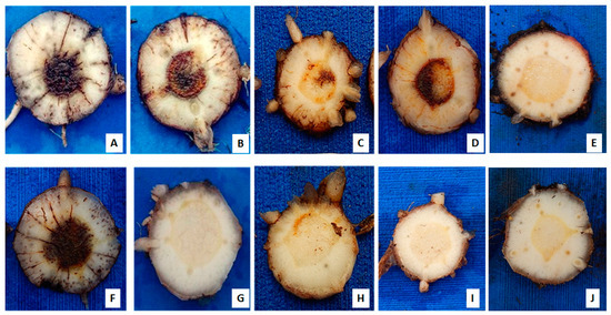 Internal symptoms of Fusarium oxysporum f. sp. cubense (Foc) in banana rhizomes ‘Prata Anã’ (top) and ‘Grand Naine’ (bottom), 85 days after inoculation in a greenhouse condition using Foc isolates from Brazil. (A,F) isolate 218A; (B,G) isolate 0801; (C,H) isolate 225B; (D,I) isolate 221A; and (E,J) controls without inoculation.