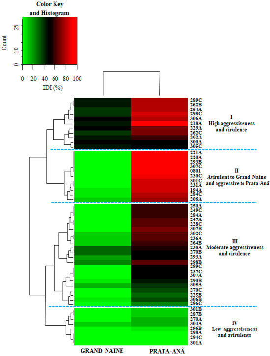 Based on the cluster analysis from the ID and by the Scott–Knott test of the 52 Foc isolates in ‘Grand Naine’ and ‘Prata-Anã’ cultivars, there were significant differences in the aggressiveness and virulence of the isolates (Figure 2, Table S2). These differences were represented according to a color scale in relation to the percentage of disease caused by each isolate (Figure 2).