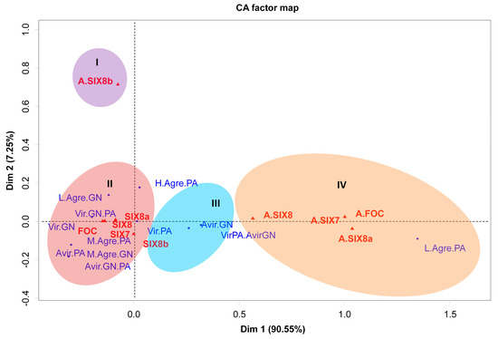 Correspondence analysis (CA) was used to correlate the presence or absence of primers (FOC, SIX7, SIX8a, and SIX8b) with virulence and aggressiveness traits for the two principal components of the data. The CA analysis indicated the formation of four clusters regarding the aggressiveness and virulence pattern of isolates, and four clusters were formed (Figure 6). The correspondence group ‘I’ shows the lack of association of the absence of bands for the SIX8b gene and any pathogenicity trait. However, contrasting results were noticed as to the presence/absence of the other genes studied.