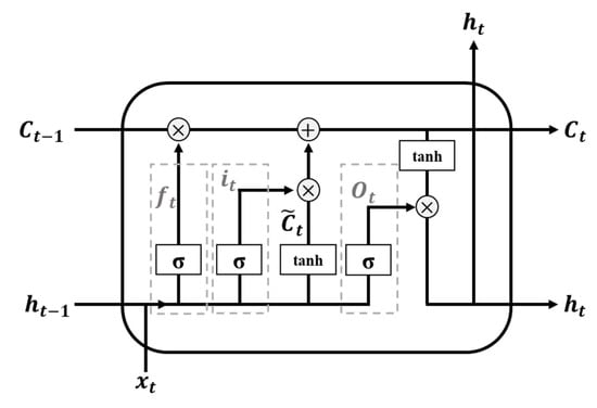 LSTM networks are widely used for processing time-series data because of their ability to capture and model temporal dependencies []. The core concept of LSTM is the cell state, which allows for the selective retention or modification of information through three gates: input gate (), forget gate (), and output gate (). The model structure of LSTM is shown in Figure 2, and the following equations can describe the mathematical steps []: