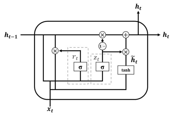 The GRU is derived from LSTM with fewer parameters and higher computational efficiency. It has two gates, called update and reset gates, to control the information transferred in the hidden state. The role of the update gate is to control which parts of information can be updated or preserved in the next hidden state. The reset gate controls which parts of the previous hidden state are used to merge the new input information. The model structure of GRU is shown in Figure 3, and the mathematical steps can be shown as the following equations []: