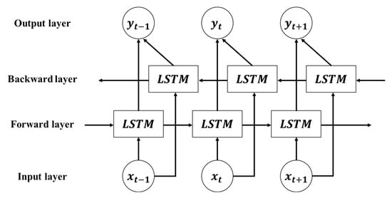 The BILSTM network consists of forward and backward LSTM, which can process sequential data in the forward and backward directions. The above characteristics allow the network to capture information from past and future contexts, enhancing its ability to understand the temporal dependencies within the data. The BILSTM network structure is shown in Figure 4 and was implemented with the following equations []: