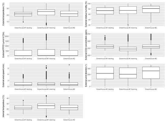 Greenhouse #1 data were divided into 90% training data, 5% validation data, and 5% testing data to allow the proposed models to learn the changing patterns. However, this scheme might be too constrictive to allow for unbiased error estimations in the independent testing set, so it was difficult to determine whether the testing performance was due to overfitting. Therefore, a total of 17,843 climate data collected from Greenhouse #2 were utilized as another testing set to evaluate the generalizability of the proposed forecasting models established using the Greenhouse #1 data and reduce the possibility of overfitting. As mentioned previously, Greenhouse #2 had different specifications (29.2 m long, 24 m wide, and 4.4 m ridge height; covered by a 0.15 mm plastic film) and tomato variety (beef tomato cv. “993”) from Greenhouse #1 (12 m long, 5 m wide, and 4.3 m ridge height; covered by a 0.18 mm plastic film and planted cherry tomato cv. “Rosada”). The boxplots also show that the distributions of external and internal climate data collected from the two greenhouses are slightly different (Figure 5). Therefore, Greenhouse #2 can be regarded as a different condition to test the forecasting models established in Greenhouse #1.