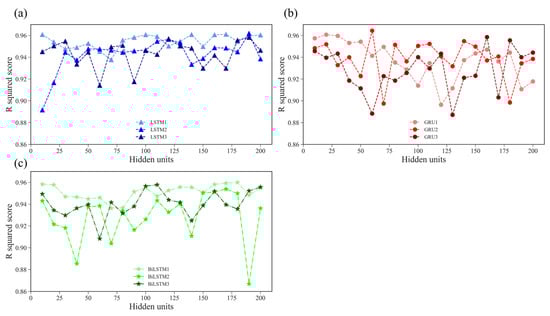 R2 for LSTM, GRU, and BILSTM models with the different numbers of hidden layers and hidden units: (a) LSTM models, (b) GRU models, and (c) BILSTM models. The temperature data used for evaluation were collected from Greenhouse #2.