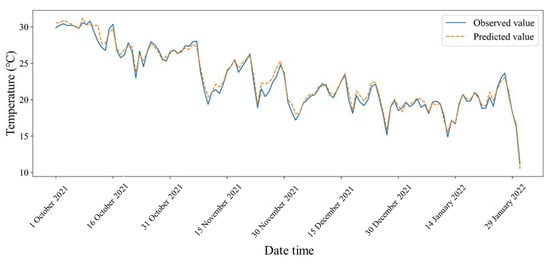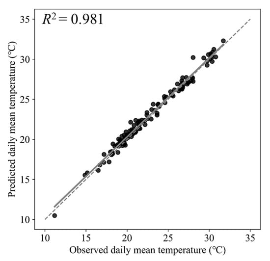 As the calculation of GDD required the daily mean temperature, the predicted temperatures of the LSTM2 model were applied to calculate the daily mean temperature. Figure 7 presents the comparison results of the predicted daily mean temperature and the observed daily mean temperature during the period from October 2021 to January 2022 inside Greenhouse #2. During the four months of the test period, the daily mean temperatures predicted by the forecasting model were very close to the actual values. Furthermore, the fitted regression line for the predicted and the observed values almost overlapped with a straight line with a slope of 1 and its R2 was 0.981 (Figure 8). These results show that the LSTM2 model is accurate in predicting internal temperature and has no tendency of overestimation or underestimation, even when applied to a greenhouse that was not used in the modeling.