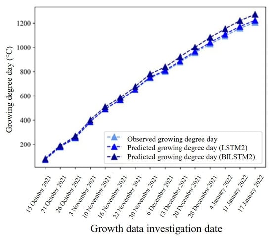 LSTM2 (the best model) and BILSTM2 (the worst model with a lower R2 and higher MAPE and RMSE) were compared to demonstrate the benefits of accurate temperature forecasting models. The GDD values were calculated using the observed and predicted mean temperatures from the two temperature forecasting models. Figure 9 shows the observed and predicted GDD values for the 94-day investigation period. For the last day of investigation, the predicted GDD calculated using the results of the LSTM2 model was 16.28 °C higher than the observed GDD. However, the predicted GDD calculated using the BILSTM2 model results was 65.47 °C higher than the observed GDD. The comparison results indicated that if the temperature forecasting model had a better performance, the value of the predicted GDD would be closer to the actual value. As the prediction error of the forecasting model increased over time, the difference between the predicted and the observed GDD values increased. When the crop growth days were longer, the gap between the actual and the predicted values would be wider. Therefore, an accurate temperature forecasting model would be beneficial for monitoring the changes in the microclimate conditions inside the greenhouse.