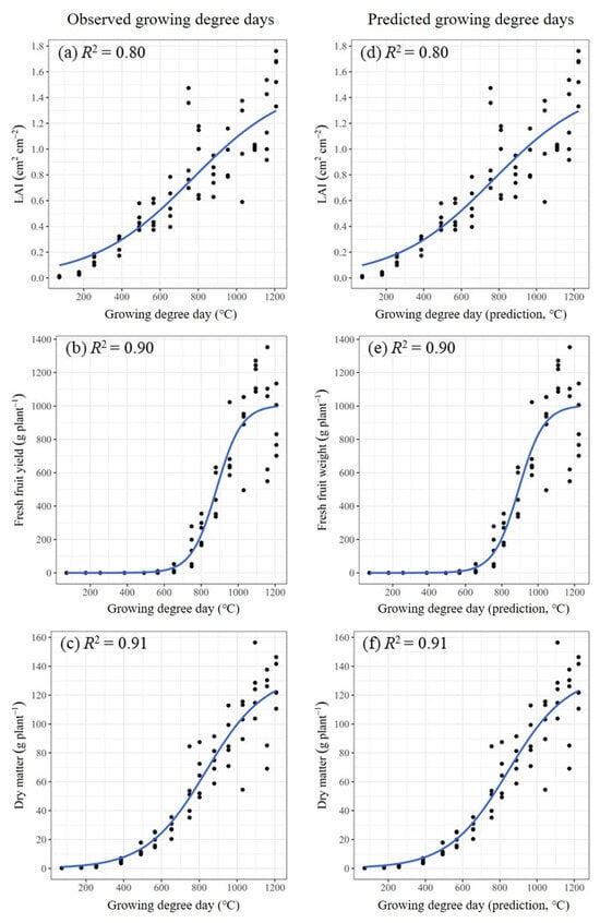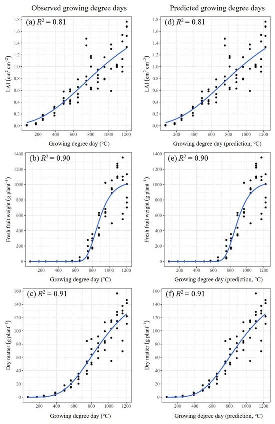 Scatter plots of the actual growth trait observations versus the observed growing degree days and the predicted growing degree days, respectively. The solid point (•) denotes the observed trait values and the growing degree days, and the blue curves represent the predicted value using the Logistic growth model. (a) Leaf area index, (b) fresh fruit weight, and (c) dry matter fitted with the growing degree days calculated using the observed daily mean temperature. (d) Leaf area index, (e) fresh fruit weight, and (f) dry matter fitted with the growing degree days calculated using the LSTM2-predicted daily mean temperature.