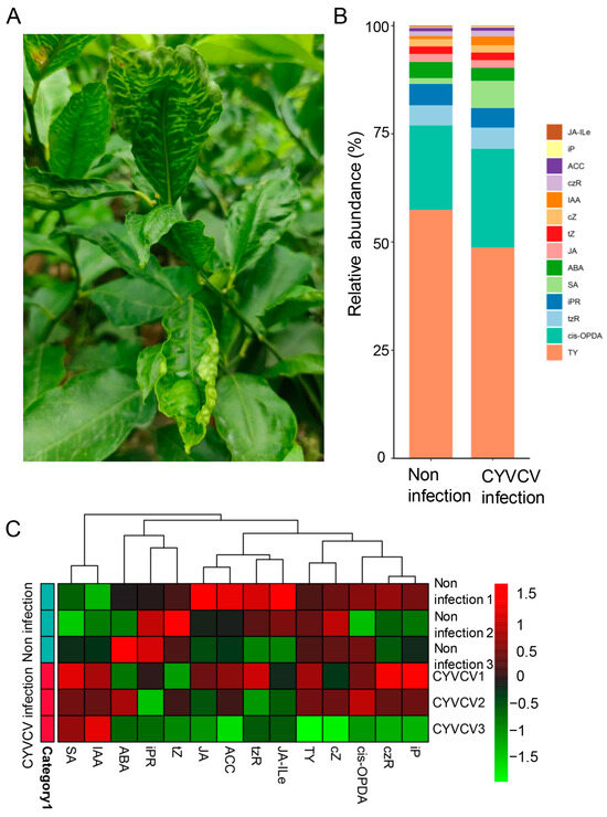 Changes in the phenotype and phytohormone levels of Citrus limon infected with Citrus yellow vein clearing virus in the field. (A) Phenotype of Citrus limon infected by CYVCV in the field. (B) The relative abundance of plant hormones in the targeted metabolome. (C) The distribution of metabolite content in each sample.