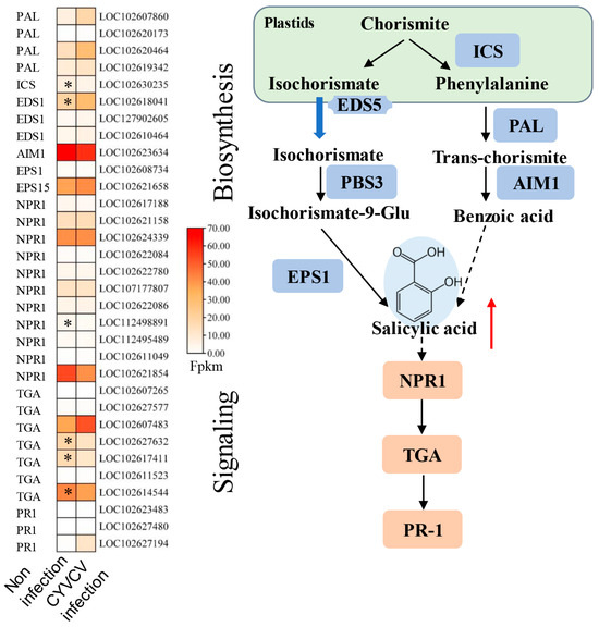 Expression of genes involved in SA biosynthesis and signaling pathways. Diagram showing the phytohormone signaling pathways. Heatmap analysis of log2-fold changes; the asterisks in the heatmaps represent the DEGs. The list of DEGs is shown in Table S6. ICS: Isochorismate Synthase, NPR1: BTB/POZ domain and ankyrin repeat-containing protein, TGA: transcription factor TGA, PR1: pathogenesis-related protein 1, PAL: phenylalanine ammonia-lyase, EDS1: enhanced disease susceptibility 1 protein, EPS1: epidermal growth factor receptor substrate 1. The red arrow indicates upward adjustment, * indicated p values ≤ 0.05.