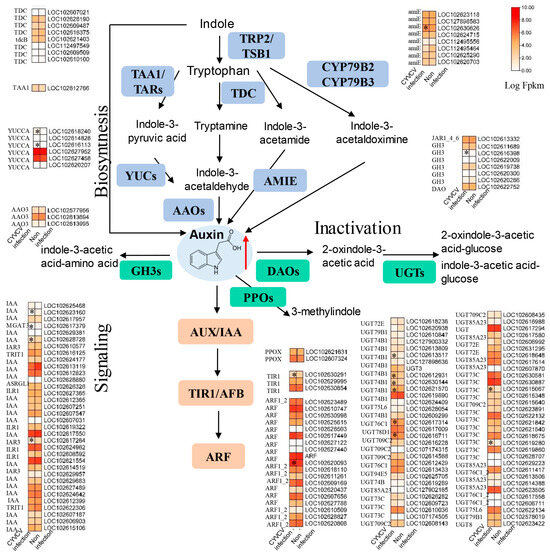 Due to the changes in phytohormones at the metabolic and transcriptional levels, we analyzed the expression of genes involved in phytohormone biosynthesis pathways. As shown in Figure 3 and Table S6, CYVCV infection increased SA levels, 11 genes were associated with SA biosynthesis, and 21 genes were associated with SA signal transduction. In the SA biosynthesis process, the majority of these DEGs were downregulated. Isochorismate synthase (ICS, LOC102630235) was significantly upregulated, and enhanced disease susceptibility 1 (EDS1, LOC102618041) was significantly downregulated in the CYVCV infection groups. During the SA signal transduction process, the BTB/POZ domain and ankyrin repeat-containing protein (NPR1, LOC112498891) were induced in the CYVCV infection groups. We also analyzed the expression of genes involved in auxin biosynthesis pathways. As shown in Figure 4 and Table S6, CYVCV infection induced IAA levels, and a total of 154 genes were associated with IAA biosynthesis, inactivation, and signal transduction. The expression of indole-3-pyruvate monooxygenase (YUCCA, LOC102618240, and LOC102616113) was upregulated. Amidase (amiE, LOC112495464) was suppressed significantly during the auxin biosynthesis process. Auxin-responsive GH3 (GH3, LOC102616398) and UDP-glycosyltransferase (UGT74B1, LOC102613517, LOC102612931, LOC102630144, LOC102621570…) genes involved in the auxin inactivation process were differentially expressed in the CYVCV infection groups. Our results explored the key genes related to SA and IAA biosynthesis inactivation and signal transduction processes and elucidated the phytohormone changes after CYVCV infection. The infection led to increased SA levels and altered expression of genes associated with SA biosynthesis and signal transduction. Additionally, CYVCV infection induced IAA levels and affected the expression of genes involved in IAA biosynthesis, inactivation, and signal transduction.