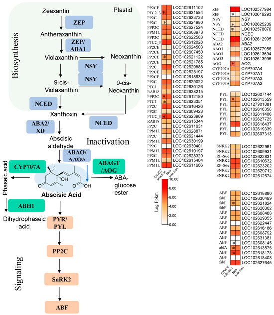 Expression of genes involved in ABA biosynthesis and signaling pathways. Diagram showing the phytohormone signaling pathways. Heatmap analysis of log2-fold changes; the asterisks in the heatmaps represent the DEGs. The list of DEGs is shown in Table S6. ZEP: zeaxanthin epoxidase, NSY: neoxanthin synthase, NCED: 9-cis-epoxycarotenoid dioxygenase, ABA2: xanthoxin dehydrogenase, AAO3: abscisic-aldehyde oxidase, AOG: abscisate beta-glucosyltransferase, CYP707A: (+)-abscisic acid 8′-hydroxylase, PYL: abscisic acid receptor PYR/PYL family, PP2CE: protein phosphatase 1L, SNRK2: serine/threonine protein kinase SRK2, ABF: ABA-responsive element binding factor. The blue arrow indicates down adjustment, * indicated p values ≤ 0.05.