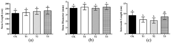 Effects of different treatments on watermelon plants. (a) The steam length of watermelon. (b) The stem diameter of watermelon. Measurement of the diameter of the fourth stem section from the terminal bud toward the root. (c) The internode length of watermelon. The internode spacing was measured as the stem length of the fourth stem node from the terminal bud toward the root. Note: all analysis based on one-way analysis of variance (ANOVA) and Duncan’s multiple tests, p < 0.05 was considered statistically significant; the columns with different letters indicate significant differences.
