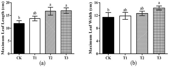 Effects of different treatments on watermelon leaves. (a) The maximum leaf length of watermelon. Measured leaf length directly from leaf base to leaf tip, excluding petiole, using vernier caliper. (b) The maximum leaf width of watermelon. Measured leaf length at the widest point on the leaf blade perpendicular to the main vein directly with a vernier caliper. Note: all analysis based on one-way analysis of variance (ANOVA) and Duncan’s multiple tests, p < 0.05 was considered statistically significant; the columns with different letters indicate significant differences.
