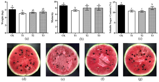 Effects of different treatments on watermelon fruits. (a) The weight of watermelon. Fruits are weighed when they reach harvest time. (b) The maturity of watermelon. (c) The soluble sugar content of watermelon. Watermelon internal fruits from different treatments; control treatment (CK) (d), T1 treatment (e), T2 treatment (f), T3 treatment (g). Note: all analysis based on one-way analysis of variance (ANOVA) and Duncan’s multiple tests, p < 0.05 was considered statistically significant; the columns with different letters indicate significant differences.