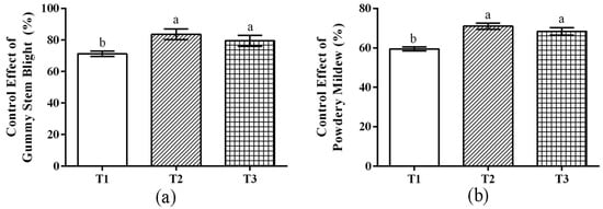 Effect of different treatments on watermelon disease control. (a) Control effect of gummy stem blight. (b) Control effect of powdery mildew. Note: all analysis based on one-way analysis of variance (ANOVA) and Duncan’s multiple tests, p < 0.05 was considered statistically significant; the columns with different letters indicate significant differences.