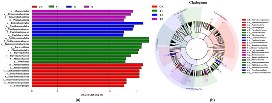 LEfSe analysis in rhizosphere soil under different treatments. (a) Histogram of LDA value distribution. (b) Branch diagram annotation for different treatments. Note: different color bars represent species with higher abundance in different treatments.