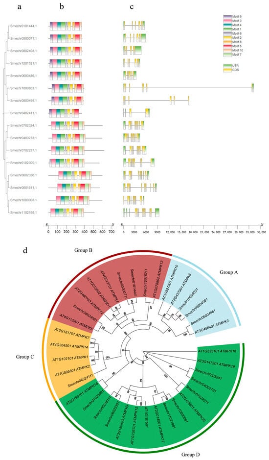Structural analysis and phylogenetic tree analysis of eggplant SmMPKs: (a) Evolutionary tree of 16 SmMPK proteins. (b) Composition and distribution of conserved motifs of SmMPK proteins. The number of motifs shown in the legend represents the predicted motif group; the colored boxes represent 10 different motifs, and the bottom scale represents the gene length. (c) The positions of the 3′ non-coding region (UTR), coding region (CDS), and conserved domains are indicated by green, yellow, blue, and pink squares, respectively. (d) Phylogenetic analysis tree of eggplant and Arabidopsis MPKs.