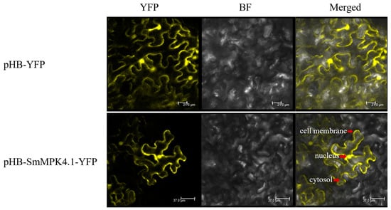 Subcellular localization in tobacco: YFP (yellow fluorescent protein field); BF (Brighted-field); Merged (a mixed field in which the yellow fluorescent protein field overlaps with the bright field). Scale bars represent 21.0, 37.0 µm in the samples of “pHB-YFP” and “pHB-SmMPK4.1-YFP”, respectively.