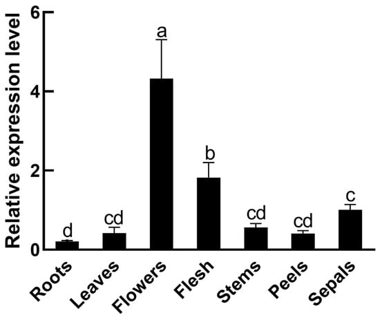 In order to determine the expression of SmMPK4.1 in different tissues of eggplant, we analyzed the expression of SmMPK4.1 in roots, stems, leaves, flowers, peels, flesh, and sepals of ‘LSHX’ using qRT-PCR. As can be seen in Figure 3, SmMPK4.1 was expressed in all tissues of eggplant, with the highest expression level in flowers, followed by flesh, and the lowest expression level in roots. These findings provide a basis for further studies on the function of SmMPK4.1 in eggplant growth and development and response to stress.