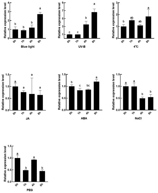 Expression of SmMPK4.1 induced by different environmental factors. The blue light treatment intensity is 3000 Lux; the UV-B treatment light intensity is 700 Lux; the treatment concentrations of MeJA and ABA are 100 μM; the treatment concentration of NaCl is 200 mM, and the treatment concentration of PEG is 10%. The error line indicates the standard deviation of three biological replicates. Lowercase letters represent the results of One-way ANOVA Duncan test analysis; p < 0.05, indicating significant differences.