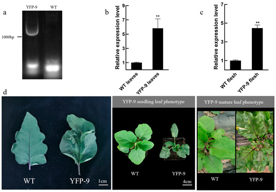 Characterization and analysis of overexpressing SmMPK4.1 plants: (a) DNA level assay of SmMPK4.1 gene in leaves of wild-type and transgenic eggplants; (b) Relative expression levels of SmMPK4.1 gene detected in wild-type and transgenic eggplant leaves, ** p < 0.01 represents a significant difference; (c) Relative expression levels of SmMPK4.1 gene in wild-type and transgenic eggplant pulp assay; (d) Phenotypes of wild-type ‘LSHX’ and transgenic eggplant leaves. The error line indicates the standard deviation of three biological replicates.